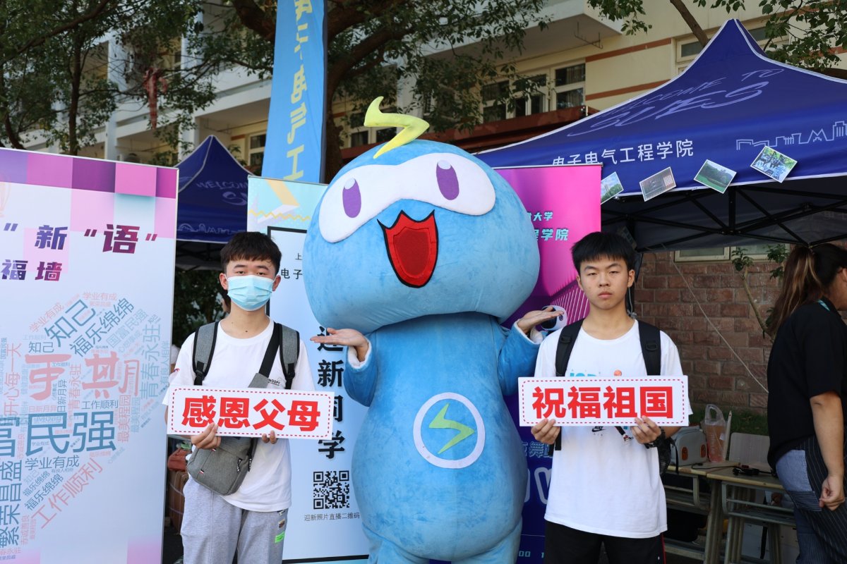 迎新日正值中秋,且国庆将至,祝福墙上罗列出对祖国、对父母、对师长、对同学的祝福关键词,新生随意选择其中要祝福的对象送出祝福。