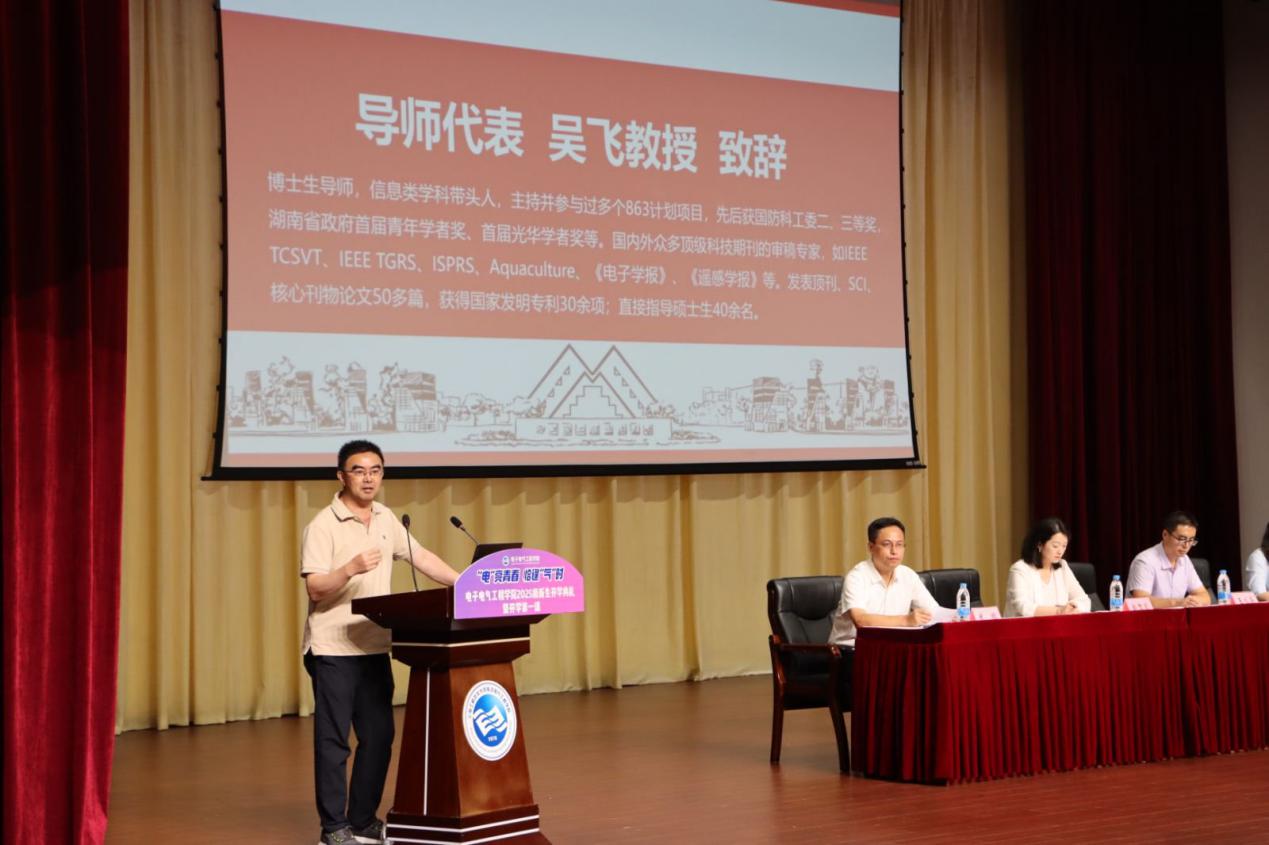 学院党委副书记赵梦影介绍2025级研究生分班及班主任情况。她指出,班主任将协同硕导、辅导员、研究生秘书等共同为研究生成长搭建多维育人模式,为研究生提供全方位的支持与帮助。吴飞教授代表硕导发言。作为深耕教学科研一线多年的资深导师,吴飞教授以“学术路上的同行者”身份,与新生们分享心得。吴飞教授的话语质朴而真诚,既传递了学术传承的温度,也为新生们快速适应研究生生活提供了实用指引。