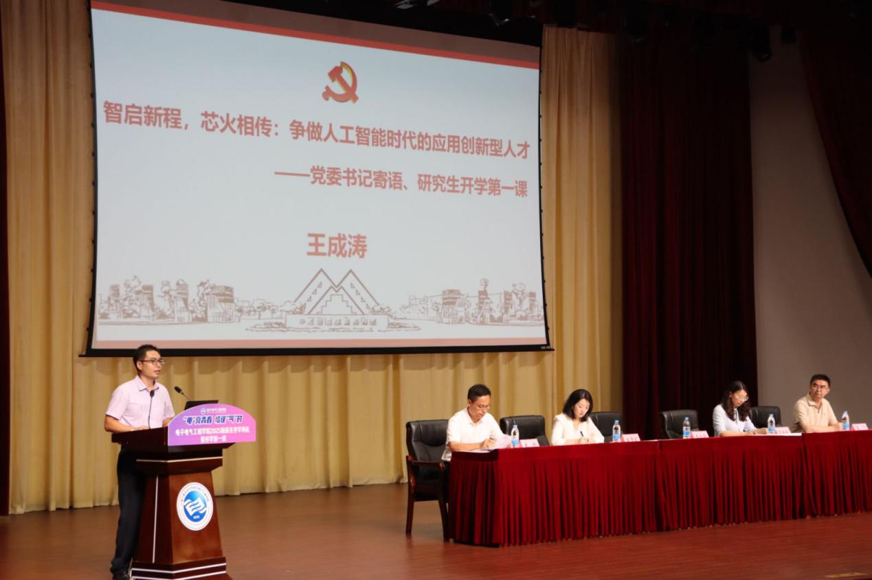 学院党委书记王成涛以“智启新程,芯火相传:争做人工智能时代的应用创新型人才”寄语新生暨开学第一课。他希望研究生能够把握人工智能高速发展的时代机遇,既要在“智启新程”中勇立潮头,开拓视野、敢于创新,也要在“芯火相传”中赓续奋斗精神,薪火不息、代代相传。并指出硕士阶段的学习是学习范式、思维方式和能力要求的深刻转变。同时给同学们提出三点希望和要求:要坚定理想信念,涵养深厚家国情怀,不断提升政治素养;要深耕学术研究,锻造卓越创新精神,勇攀科学技术高峰;要积极参与实践,淬炼过硬服务本领,实现知行合一升华。书记的寄语既是祝福,也是嘱托,更是激励,激发了全体新生奋发图强、勇毅前行的信心与决心。