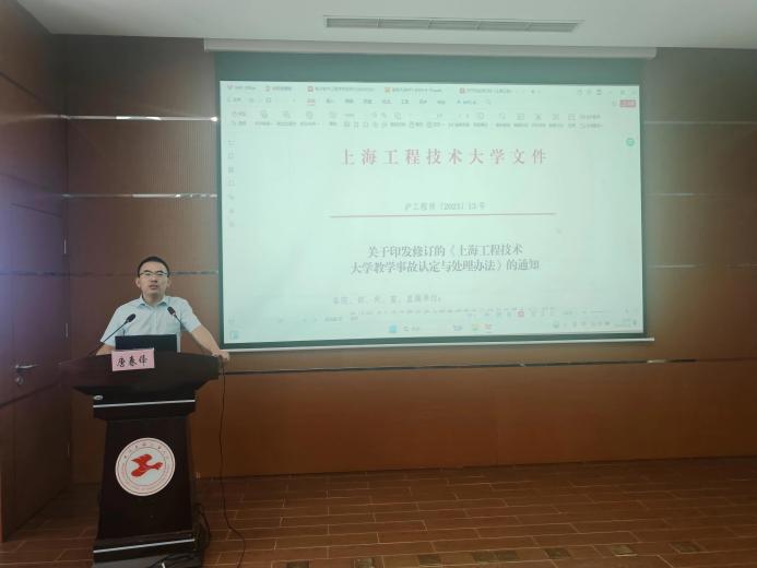 会前,特邀质量管理办公室唐春锋老师作教职工政治理论学习教育专题报告,详细解读《上海工程技术大学教学事故认定与处理办法》。