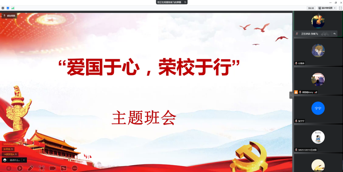 新冠肺炎疫情当前,为有效做好疫情防控宣传,加强与学生之间的沟通,3月16日下午,研究生二年级辅导员张晓飞老师和郭丽娟老师在线上给大家开展了名为“爱国于心,荣校于行”的线上主题班会。