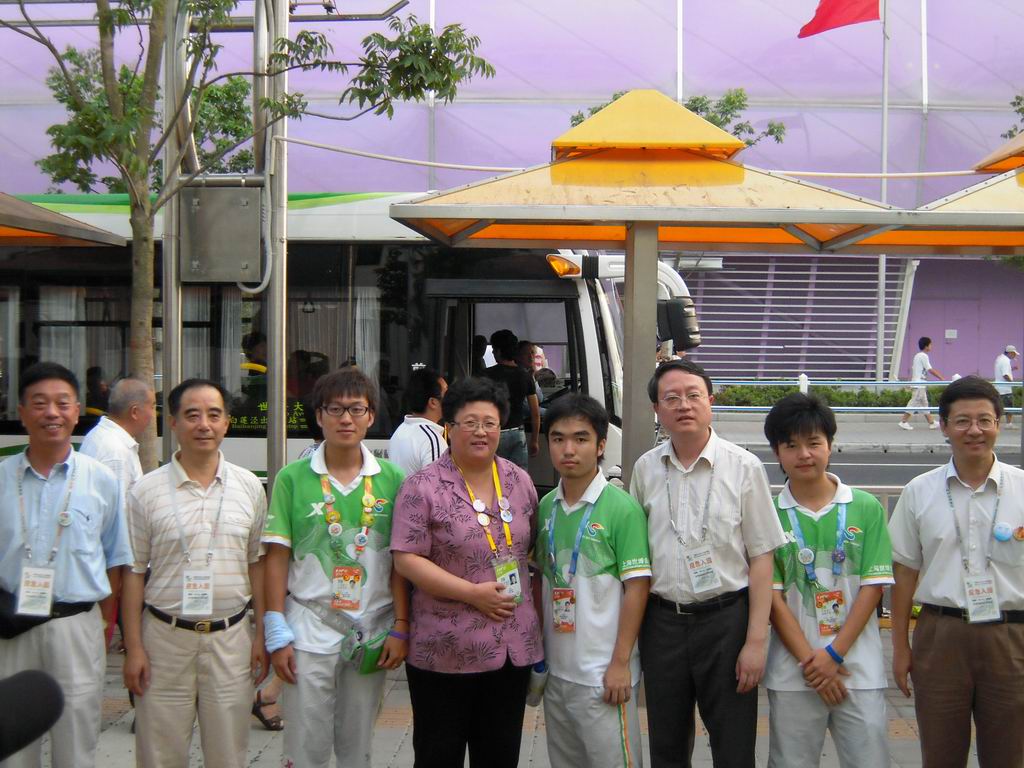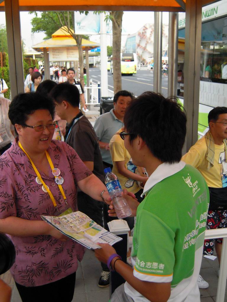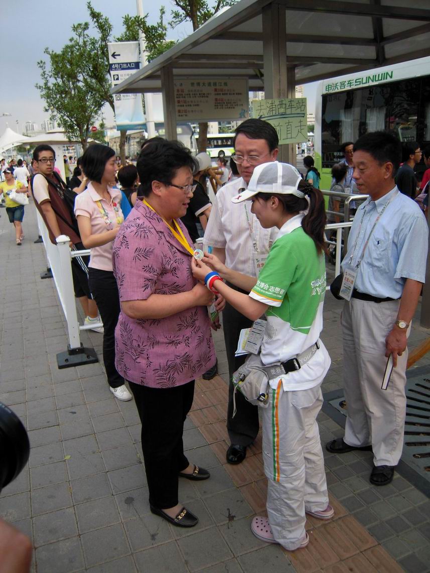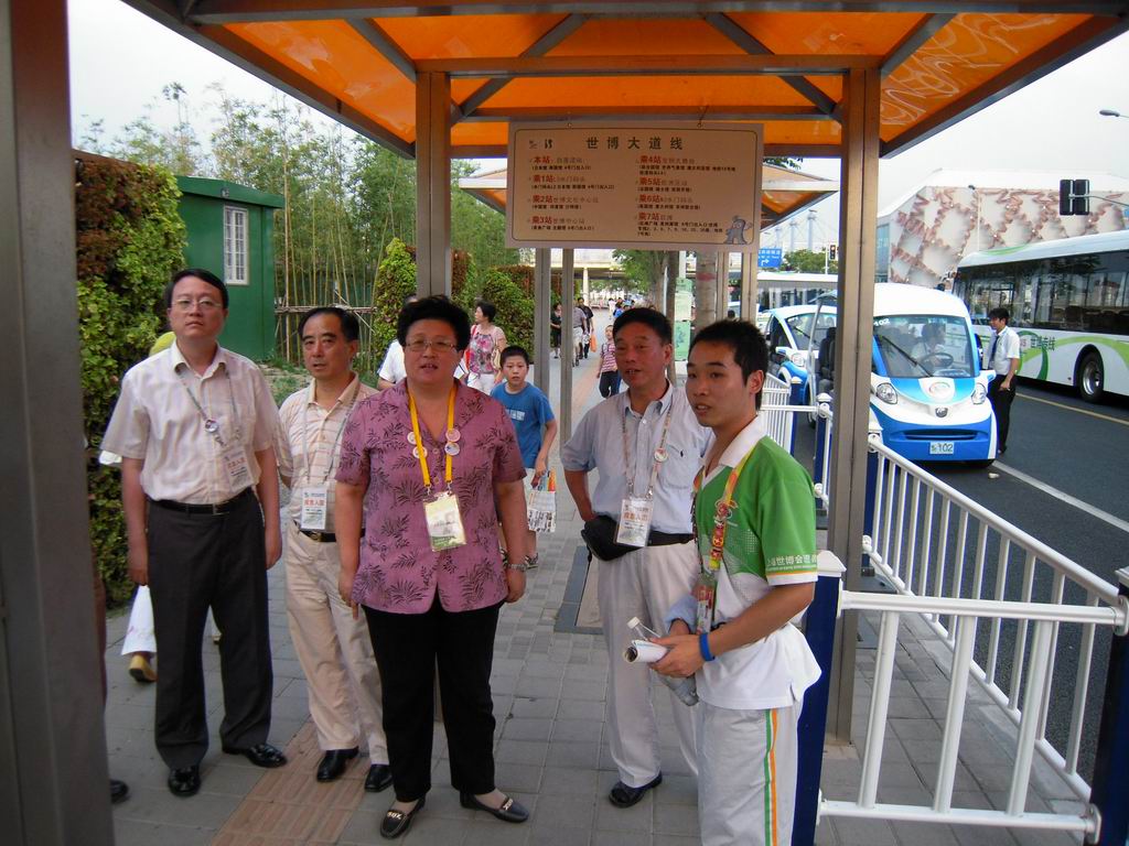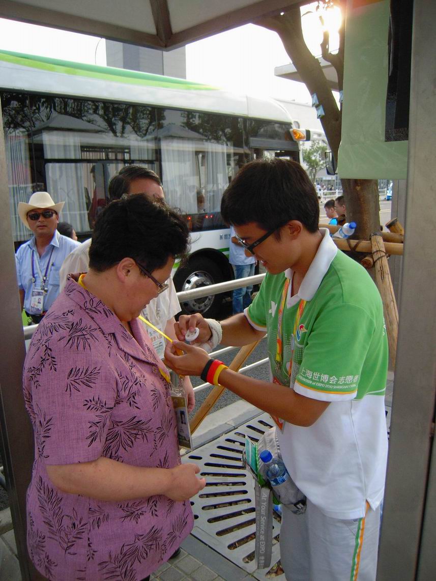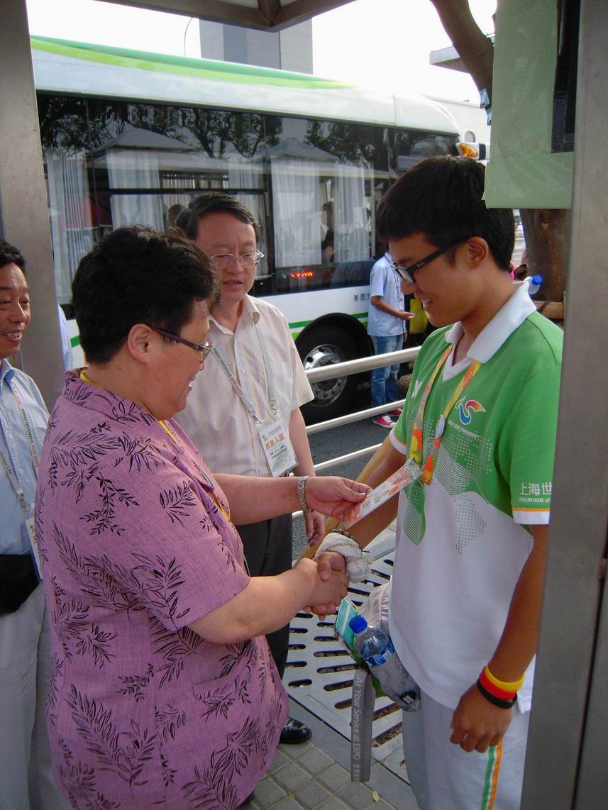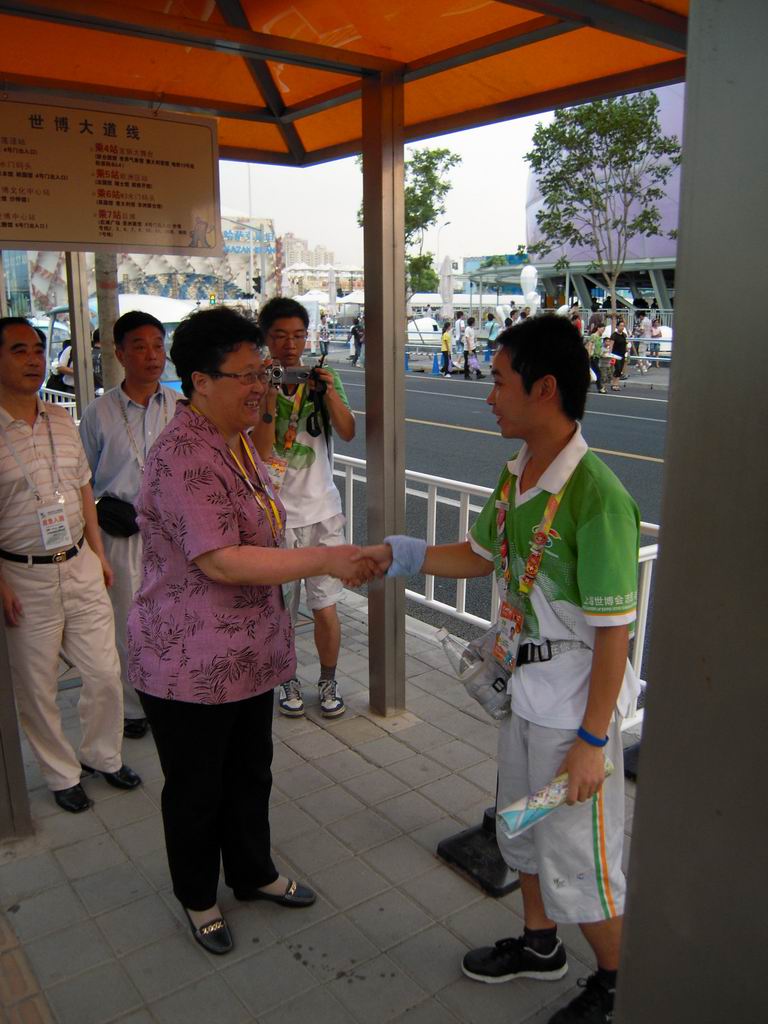 校领导先后来到世博园高科西路、博成路口和白莲泾路交通站点,为学校程程们送去了矿泉水等慰问品。汪校长亲切地对小白菜们说:“同学们,辛苦了!”,让同学们倍受感动。在这连续的高温天,汪校长十分关心大家晚间回校后的睡眠质量,希望大家要注意防暑降温,努力奉献世博的同时也要保重身体。电气程程王淼说:“感谢学校为大家开放空调房住宿,给我们带来夏日里的清凉,更让我们保证了足够的睡眠时间,第二天精神焕发地来世博园服务”。慰问至博成路口岗点时,汪校长询问正在工作的陶烨君同学累不累,他激动万分的摇摇头:“汪校长,我们不累,我们一定为校争光,圆满完成志愿服务。”走访间,汪校长对电气学院学生设计制作的“小白菜”职务贴纸和个性徽章产生了浓厚的兴趣,电气“小白菜”争相将自己身上佩戴的“电气程程”和七个明星志愿者徽章赠送给校领导,而汪校长则回赠我校限量版的金色校徽以资鼓励。人来人往的公交站台上,电气程程与校领导在工作岗点前合影留念。