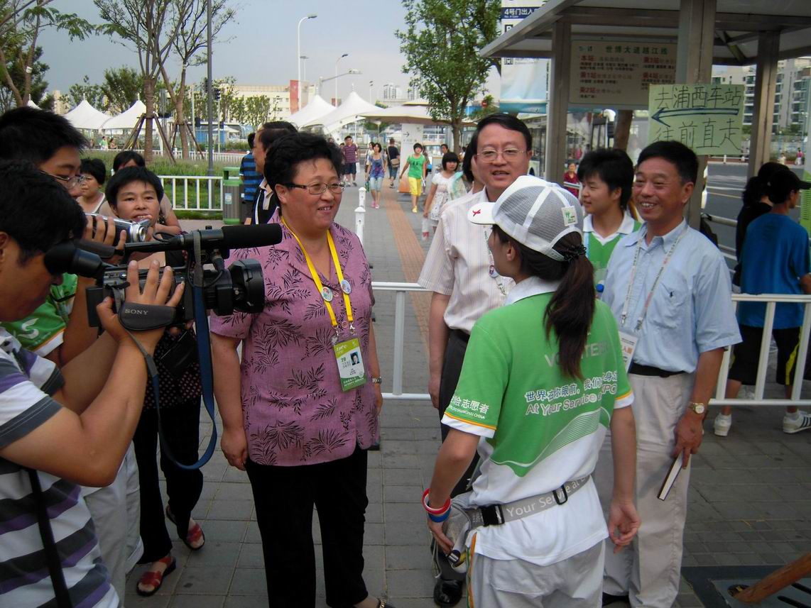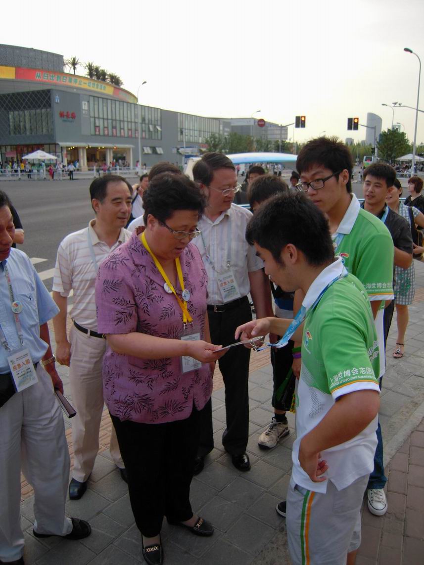8月16日下午,校长汪泓,副校长郝建平、孙培雷、陈力华、程维明,校党委宣传部部长王一川,学生部(处)长王明复,校办主任史健勇在校团委书记茅华伟和各学院分团委书记的陪同下进入世博园区慰问我校志愿者。傍晚5:15,校长汪泓等校领导在A09、A10片区,慰问yl6809永利官网程程,使小白菜们深受鼓舞。