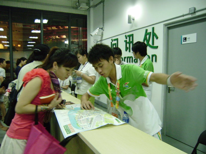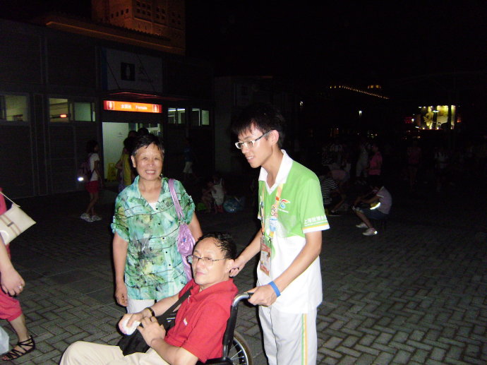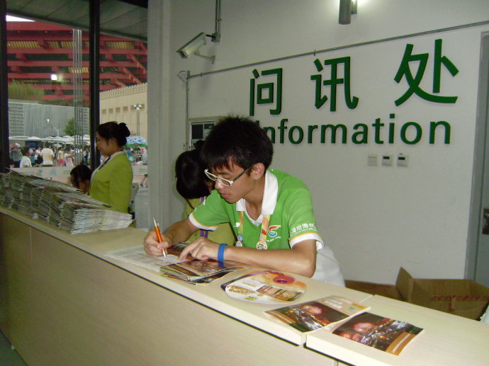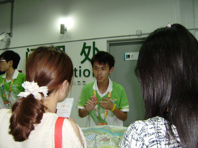 赵凡同学谈及这几天世博志愿者的服务体会时,他说:“我是一名世博手语志愿者,更是一名最平凡的世博志愿者。手语技能可以帮助残障人士,然而世博园内每天都有人需要帮助,都需要我们伸出援助之手。” “送人玫瑰,手有余香”。记得有一天离岗时分,赵凡同学曾连续帮助三位游客。在园区游玩的一对北蔡的中老年夫妇,不慎在游园时脚受伤了,来到问讯室的医疗点敷上一点药,但还是寸步难行,于是他主动请缨送他们出园,借了轮椅送他们至就近的停车场;推着轮椅从六号门进来的时候,遇到一体力不支的老人和他的家人,于是赵凡又为他们找到了附近的轮椅出租点;在赵凡同学推着轮椅回岗位的路上,在中国馆附近遇到一为志愿者带着一位与女儿失散的老人,于是他便带着他们进了就近的问讯处,通过广播寻人找到了正在尼泊尔馆附近等候的女儿,并将老人送至他女儿所在处。 “我是一名男生,要努力承担‘重’任”