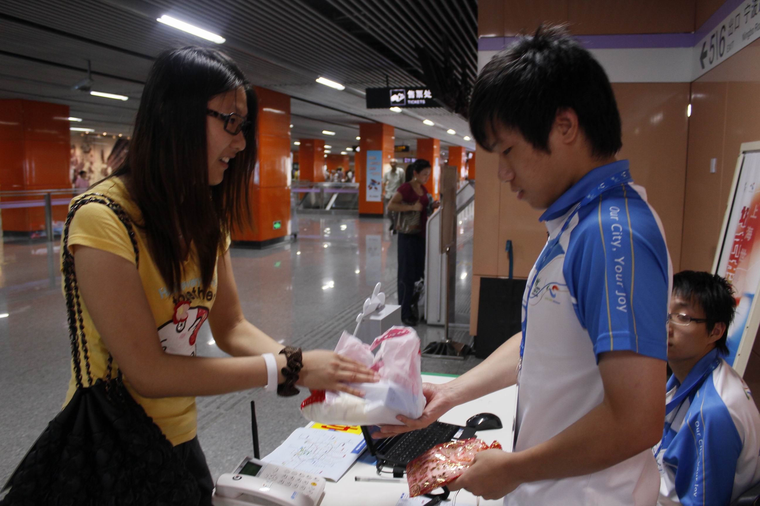 8月13号上午,yl6809永利官网志愿者城市站点学生负责人魏然同学与学院志愿者工作站“白菜守望者”负责人李春辉同学前往各地铁和宾馆站点的岗位慰问城区的“蓝精灵”,并送上了毛巾、肥皂、润喉片、薄荷膏等慰问品。同时,通过谈话,从中了解很多城区志愿者的内心世界。 在慰问过程中,上岗8天的蓝精灵向志愿者工作分站的工作人员道出了他们的心声。从开始的几天未能适应服务工作到熟练得掌握一些回答技巧和查询方法等,服务的效率大幅度的得到提高。然而当他们一开始被游客们问及公交线路的换乘时,会因找不到路线信息、站台信息或公交线路被取消、所要查询的系统未更新等问题而感到头痛。但是,经过几天的熟悉之后,能够做到很快得向游客们提供服务。