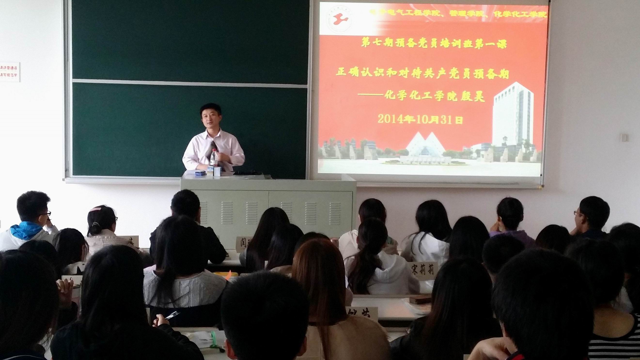 10月31日下午,上海工程技术大学第七期预备党员培训班第一课在教学楼F210开讲,化学化工学院殷昊老师作了“正确认识和对待共产党员预备期”的专题讲座,来自yl6809永利官网、化学化工学院和管理学院三个学院的全体预备党员聆听了讲座。