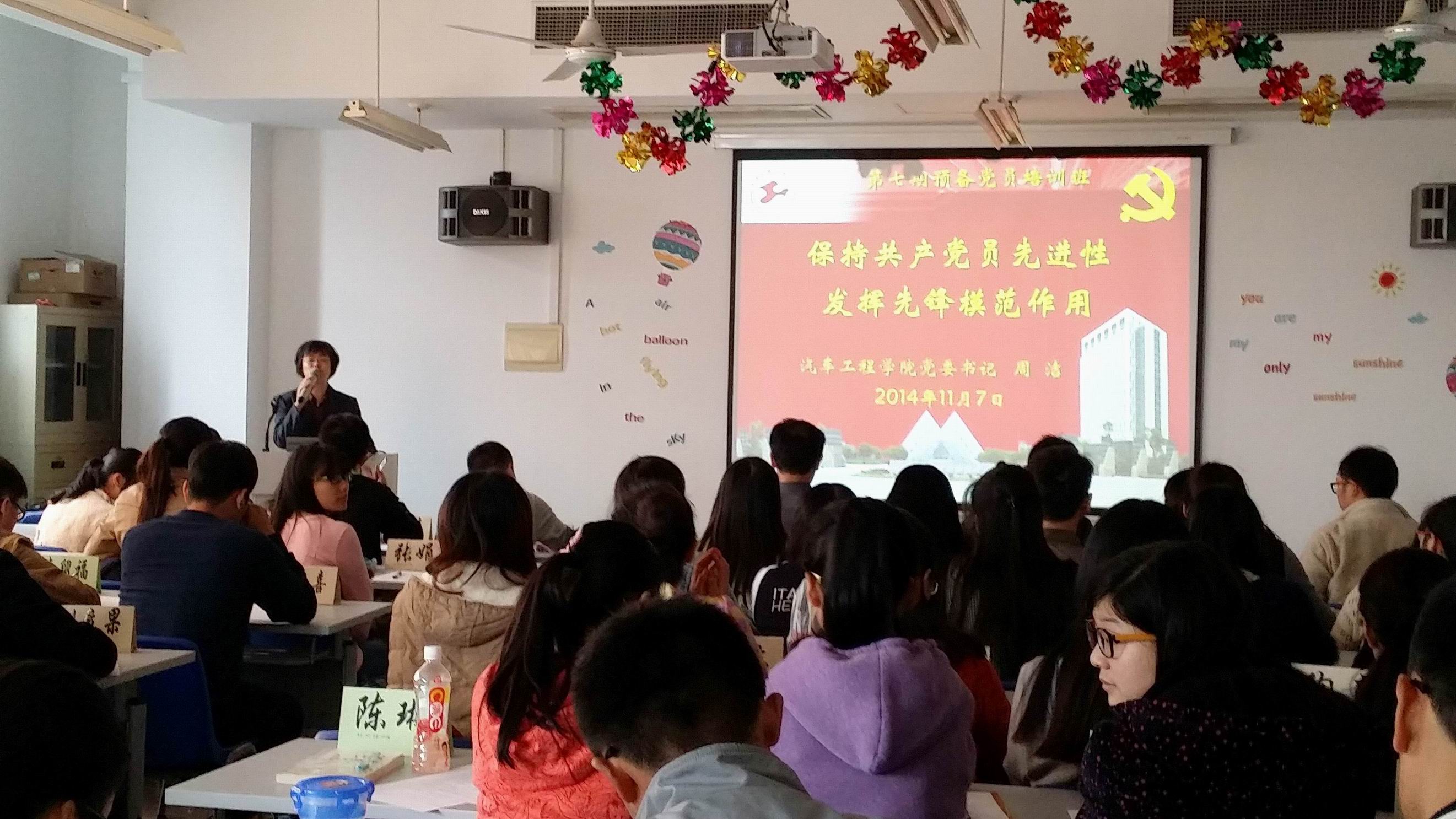 11月7日下午,上海工程技术大学第七期预备党员培训班第二讲在实训楼4405举行,汽车工程学院党委书记周洁老师给来自三个学院的全体预备党员作了名为《怎样做一名合格的共产党员》的讲课,yl6809永利官网组织员兼培训班班主任周科亮老师主持召开此次讲课。
