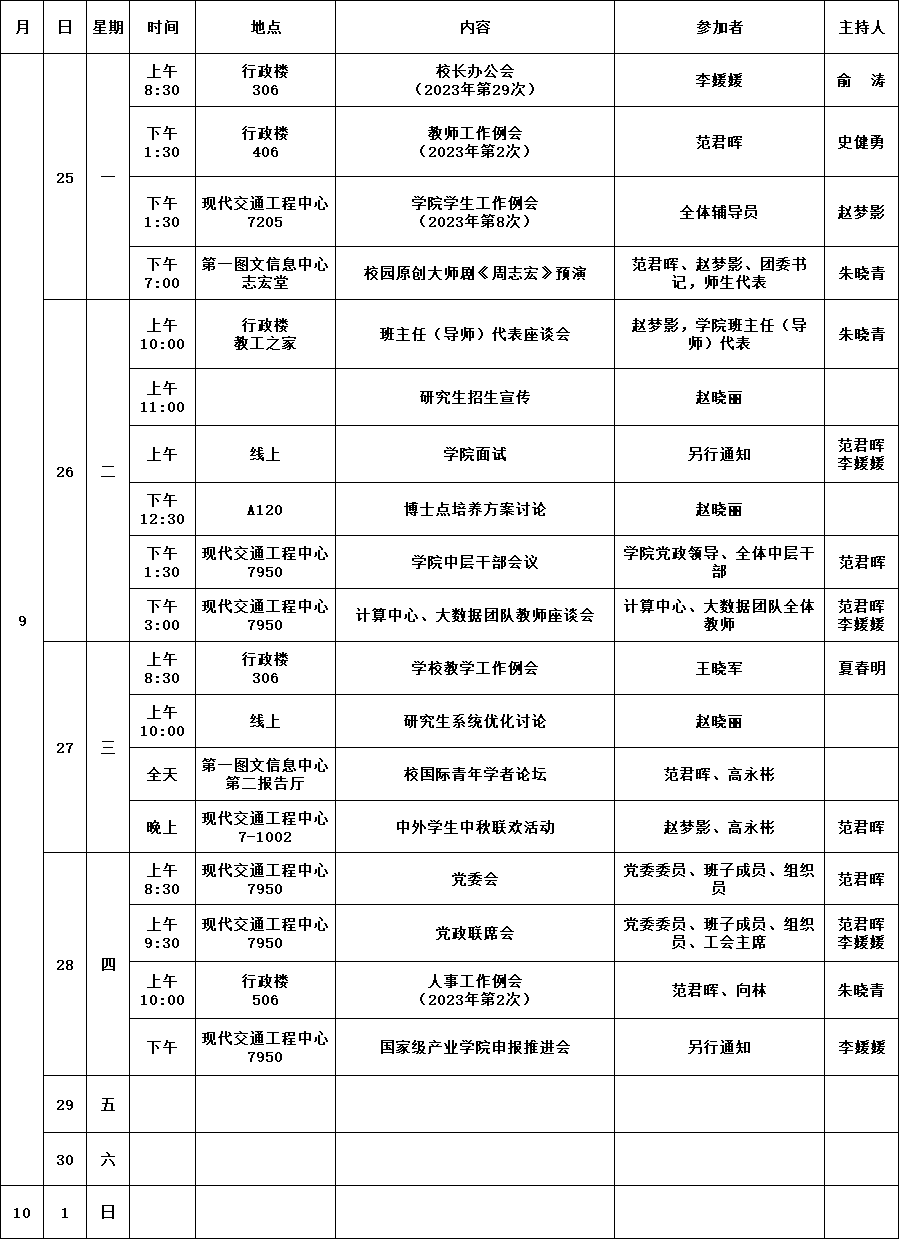 学院第3周活动安排(2023年9月25日-2023年10月1日)