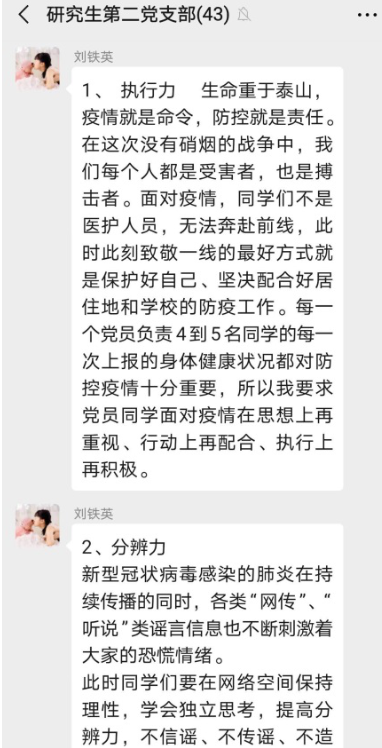 由于疫情原因,支部党员无法面对面开展沟通与交流,但大家克服困难,在微信群上发表了自己对本次疫情中各个方面的观点。支部书记刘铁英老师率先在微信群中发表了自己的看法。