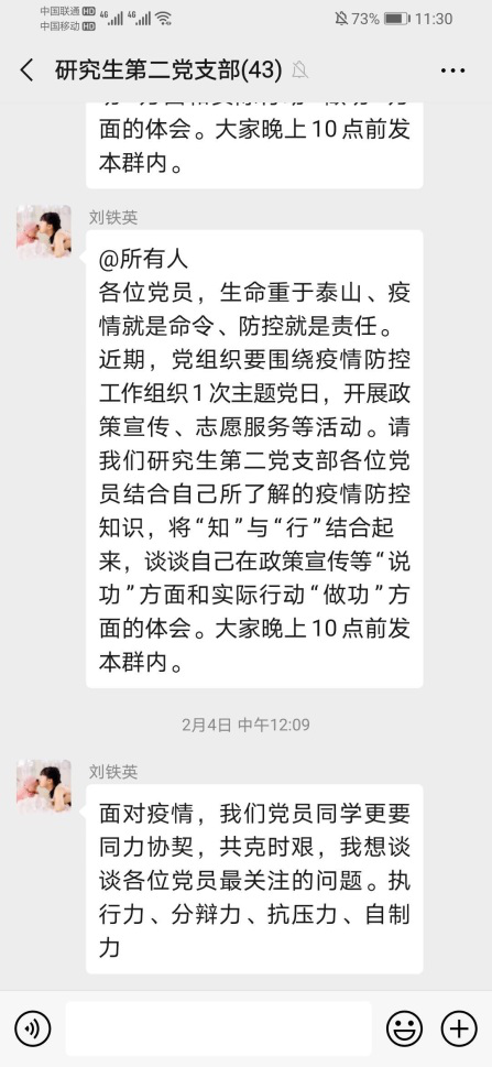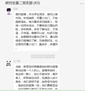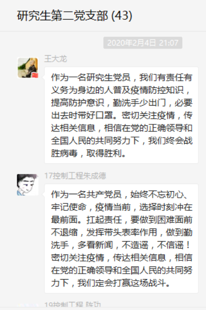 支部各位学生党员收到刘铁英老师的鼓舞,也在微信群中纷纷发声。大家表示,哪里有困难,哪里就有党员。疫情防控是一场没有硝烟的战争,作为研究生党员的我们,应当积极响应党组织的号召,发挥党员的先锋模范作用,带动身边的群众齐心协力,共同打赢这场疫情防控阻击战。对防控阻击战中的不利行为敢于提出制止,为党和政府带领人民群众打赢这场疫情阻击战提供一个可靠的保障。